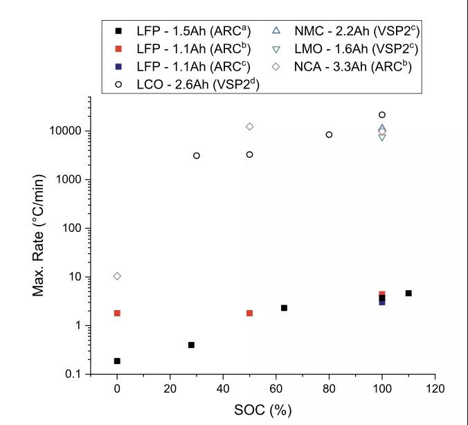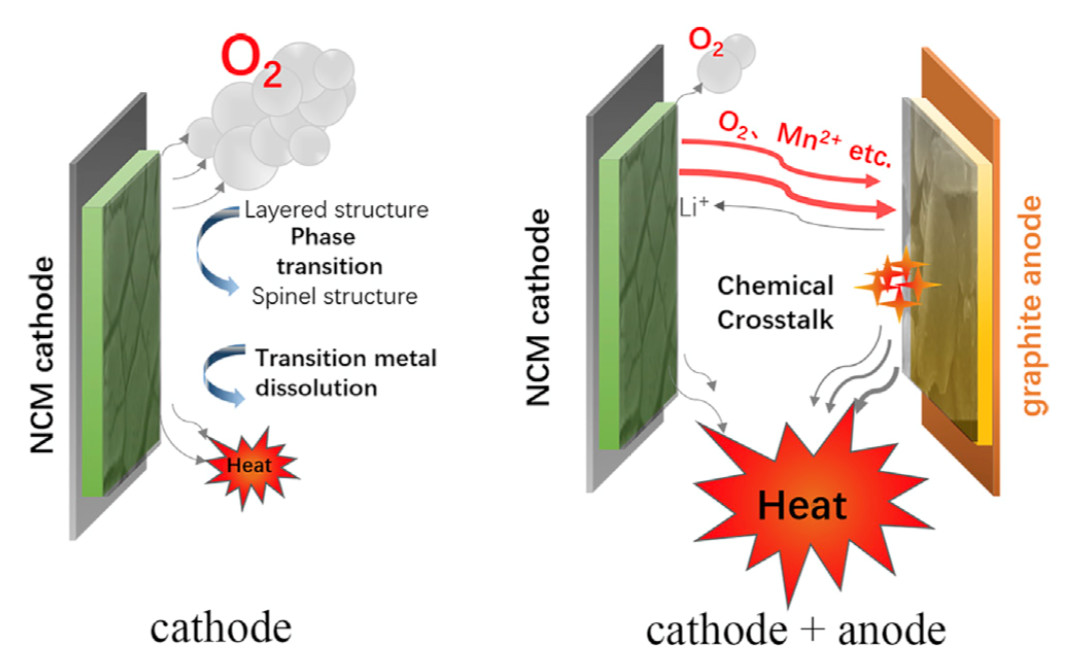 引起鋰離子電池熱失控的因素很多,例如內短路、外短路、過充、電池過熱和機械破壞等,但是內短路仍然是引起鋰離子電池熱失控的主要因素。引起鋰離子電池內短路的原因通常有生產過程中引入的金屬異物,以及充放電過程中負極形成的鋰枝晶等。一旦內短路發生,電池瞬間通過短路點進行放電,導致短路點溫度升高,引起隔膜熔化和正負極材料的分解,進而積累更多的熱量最終導致鋰離子電池熱失控。