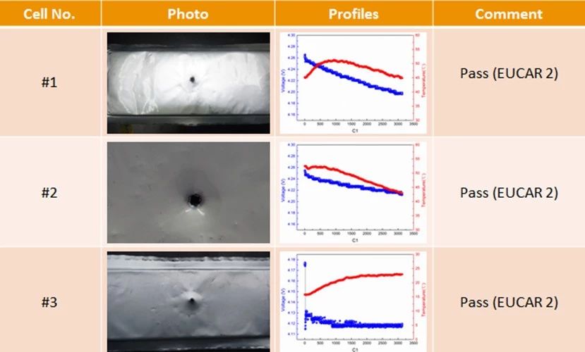 對于“安全”的堅守讓萬向獲得了豐厚的回報,在各大動力電池都在為高能量密度鋰離子電池的安全性焦頭爛額的時候,萬向又推出了能量密度達到280Wh/kg的高安全動力電池產品,該電池不僅實現了超高能量密度,還在USABC標準的針刺測試(Ф3mm,80mm/s)中實現了不起火、不爆 炸,針刺后仍然能夠維持穩定的電壓平臺,達到了EUCAR2的安全等級。在過充測試中該電池同樣表現出了驚人的安全性,順利通過1C倍率過充至2倍電壓測試,達到EUCAR3安全標準。